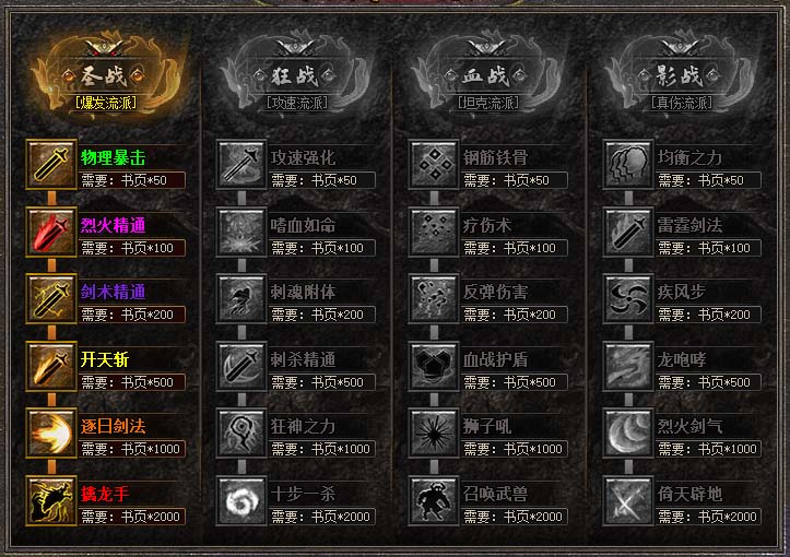 职业流派:每个职业都有相对的四个流派分支,不同的流派对应不同的技能,请谨慎选择