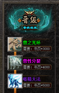 异兽系统:土城安全区右下老猎户了解详情,抽到多余的异兽可以点亮异兽谱获得强力属性加成,多余的可以回收元宝 (★注:橙色异兽可以在二大陆蛮荒部落皇宫里融合成红色异兽)